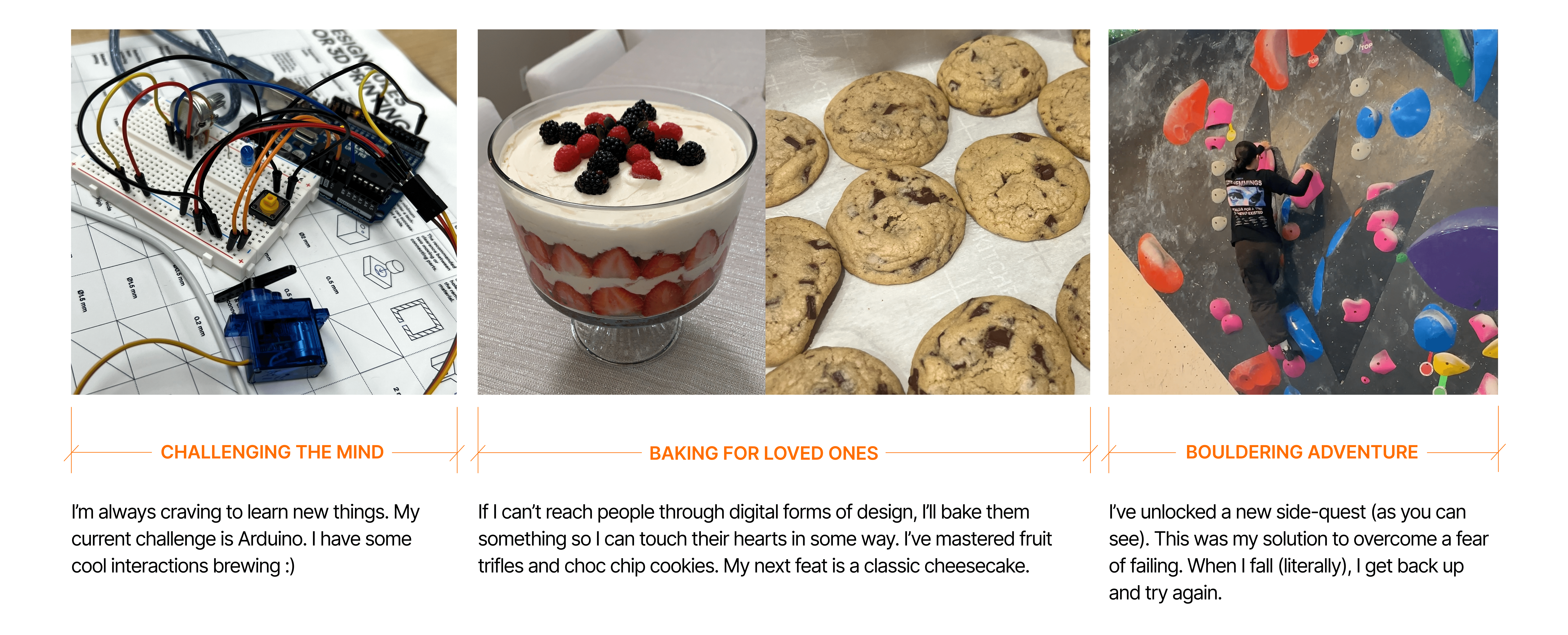 When I’m not at my desk, I’m usually refining a recipe or working a project when bouldering. I love the technicality of both: the precision of a measurement and the calculated strategy of a climb. Whether the result is a sweet victory or a laughable wipeout, I’ve learned to value the process and the insights gained along the way, bringing fresh perspectives to my next creative adventure.