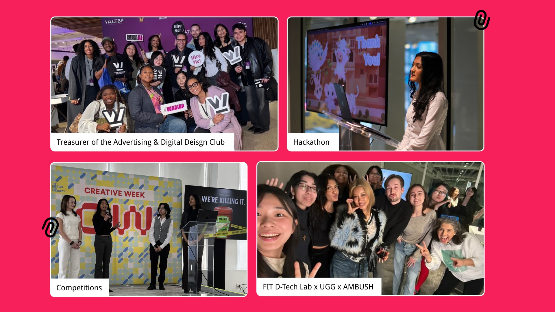 Treasurer @ FIT Advertising and Digital Design Club (Extracurricular), 08/25 - Present: Managed finance matters of the A&DD club at FIT. Aided in the organization and execution of club events/collaborations.
