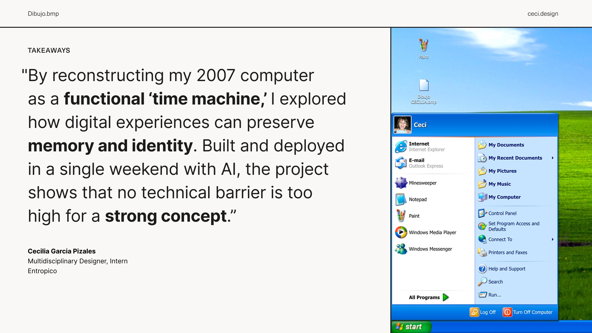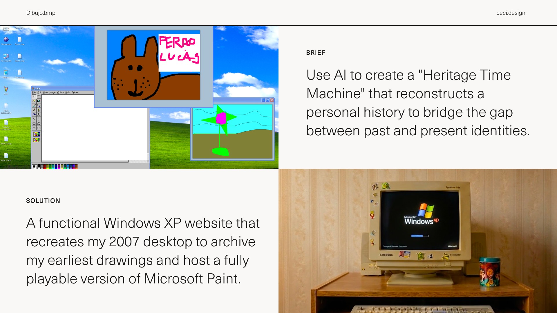 "dibujo.bmp" (drawing.bmp) is an interactive multimedia website by Cecilia Garcia that recreates her 2007 childhood desk in Argentina through a functional Windows XP interface. Built with AI tools, it transforms a personal archive of drawings into a digital time capsule, extending into a social media campaign that shares the project through reels and invites new contributions from her family.