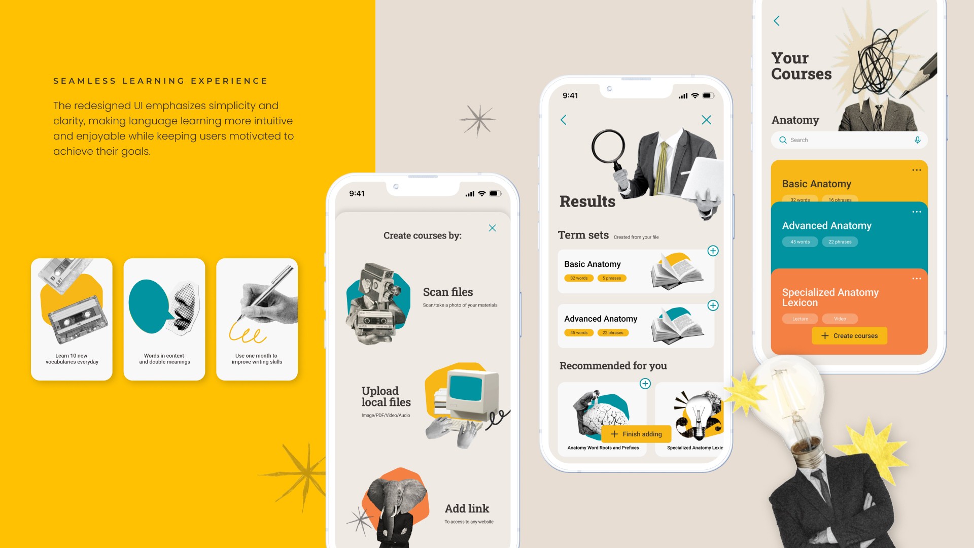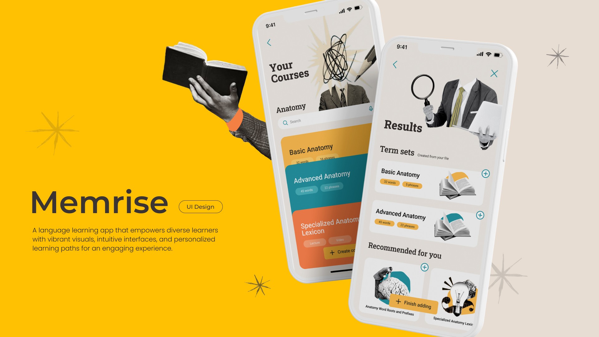 Memrise is a language learning app that uses cognitive and memorization methods, however was lacking customization, making it challenging for users to address their individual weaknesses. We are committed to delivering an engaging, interactive, and personalized learning experience to a diverse audience, utilizing a combination of photography, vibrant colors, and intuitive design to create a vibe of fun, reliability, and aspiration in our users as they embark on their learning journey.