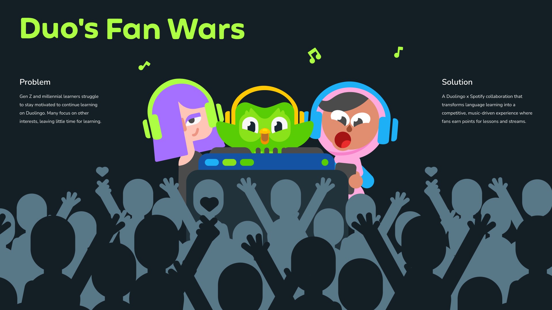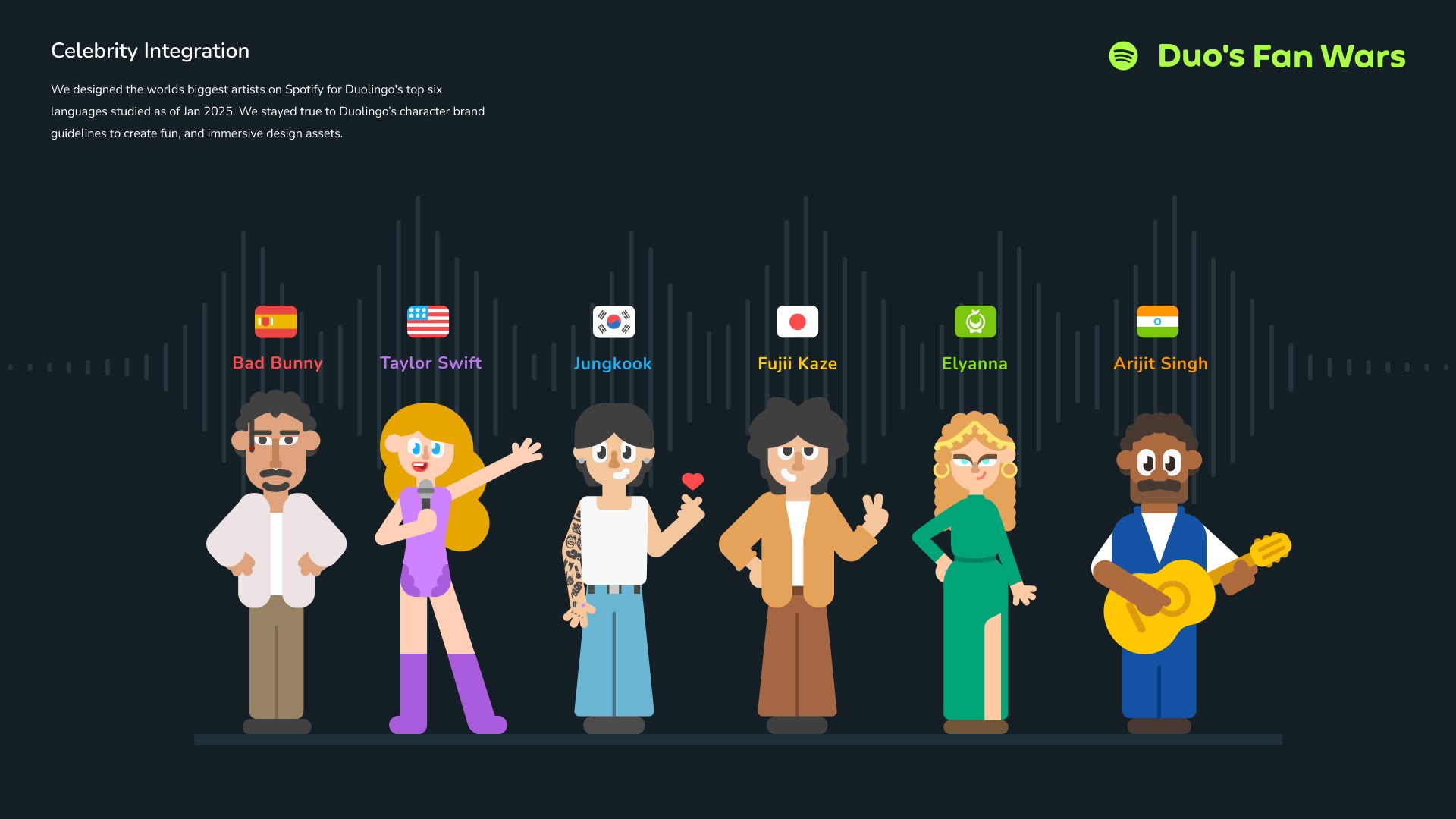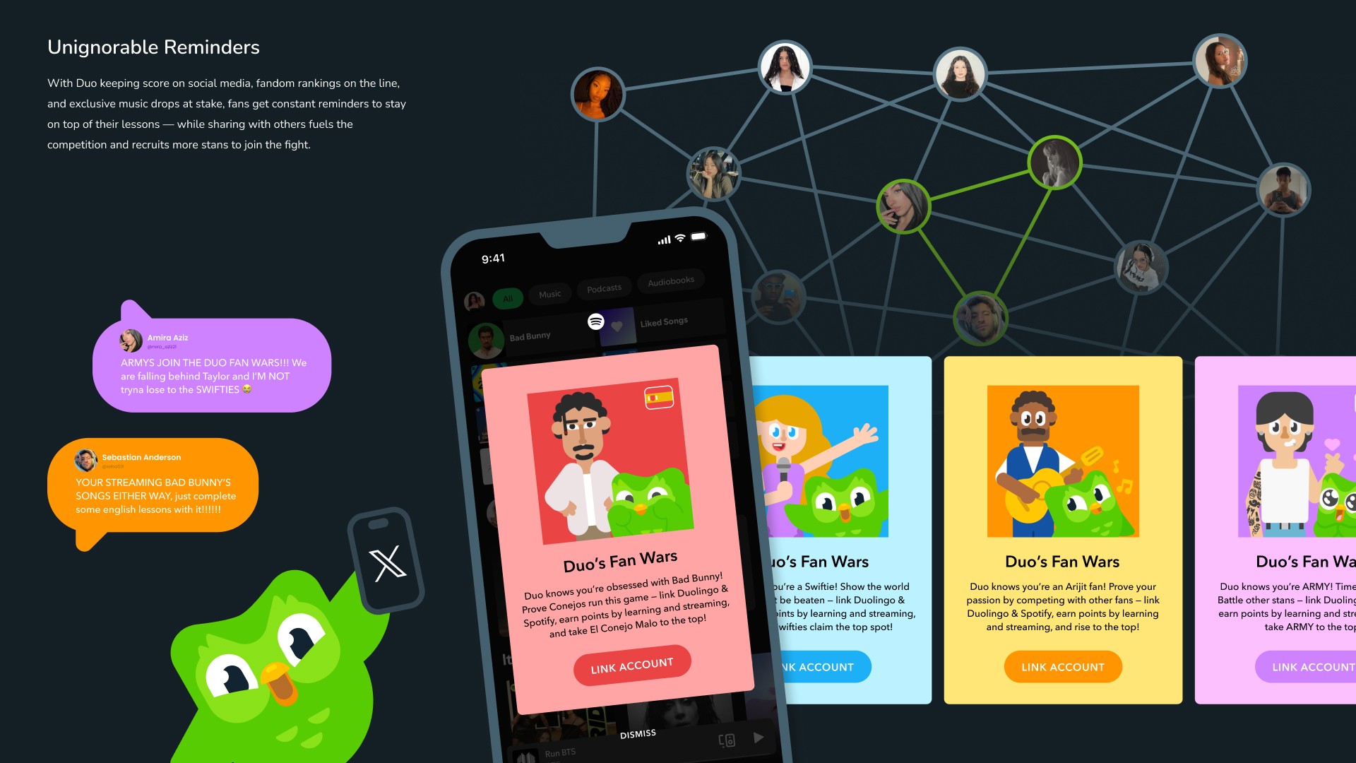 Duo’s Fan Wars sparks competition for superfans of the biggest music artists, inspiring them to learn, share, and recruit others to join the fight. By linking Duolingo and Spotify, fans unlock Duo’s Mix, earning points by completing lessons and streaming to compete for the top spot.